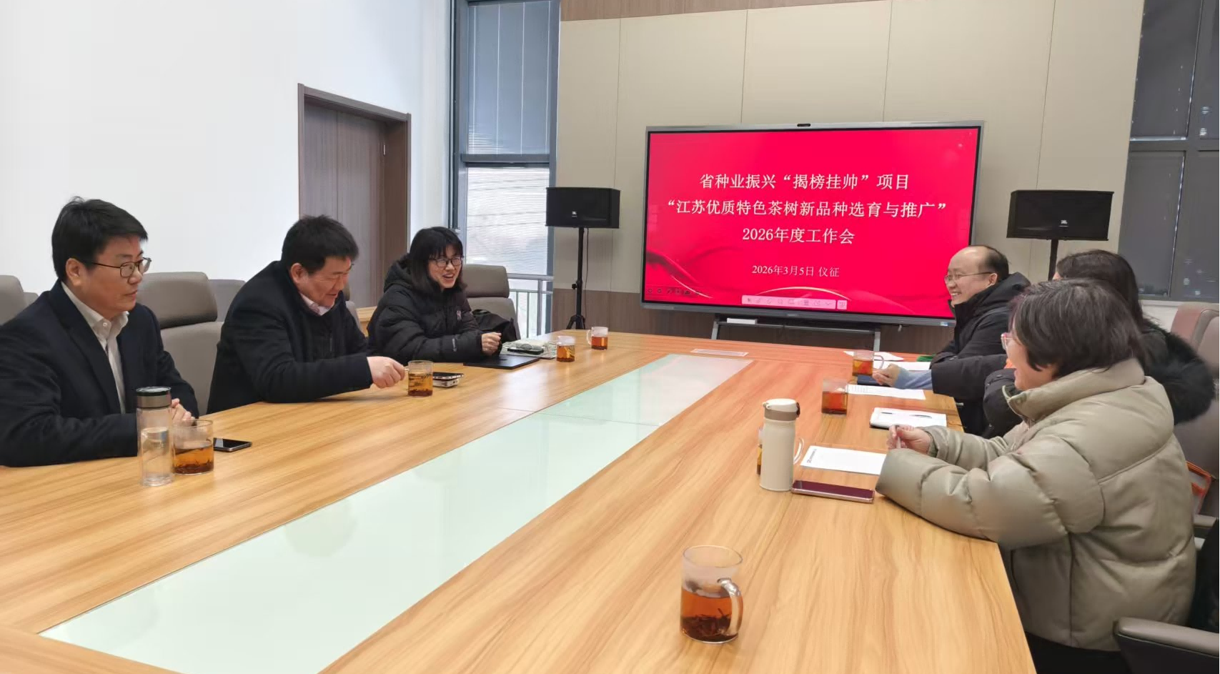 3月5日,休闲所茶团队在仪征组织召开江苏省种业振兴揭榜挂帅项目“江苏优质特色茶树新品种选育与推广”2026年度工作会,特邀国家茶叶产业技术体系首席科学家、中国农业科学院茶叶研究所副所长王新超研究员到会指导。省农科院休闲所副所长杨亦扬,江苏省农技推广总站特色园艺科副科长邢瑶,以及无锡市茶叶品种研究所所长徐德良等项目承担单位代表参加了会议,会议由项目负责人杨亦扬主持。