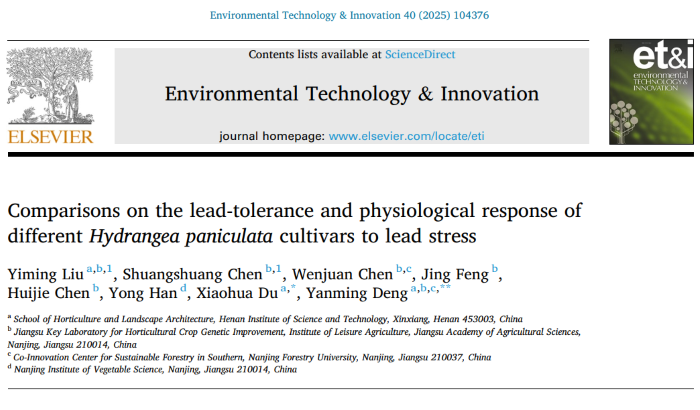 近日,休闲所花卉创新团队在国际著名期刊Environmental Technology & Innovation(JCR 1区,IF=7.1)发表了题为“Comparisons on the lead-tolerance and physiological response of different Hydrangea paniculata cultivars to lead stress”的研究论文,首次系统揭示圆锥绣球不同品种对铅胁迫的耐性差异,并阐明其生理响应机制。